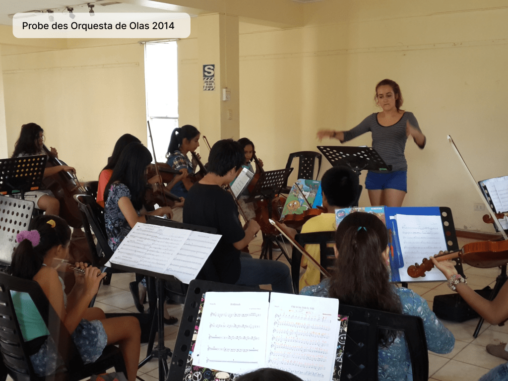 Gegründet wurde das Orchester bereits 2014 von einer der ersten deutschen Freiwilligen im Projekt als immer mehr Kinder neu mit dem Spielen eines Instrumentes begannen und die Niveauunterschiede zwischen den Schüler*innen immer größer wurden. So begann die Arbeit mit dem Orquesta de Olas. Durch das Spielen mit leeren Saiten in einigen Streicherstimmen wurde den Schüler*innen das Mitspielen im Orchester schon nach wenigen Unterrichtsstunden ermöglicht. In internen Vorspielen trat das Orchester zunächst vor einem kleineren Publikum auf, bis mit der Zeit auch größere Konzerte hinzukamen. Seit dem Sommerprojekt im Januar/Februar 2020 ist das Orchester wieder weitestgehend sinfonisch mit einem vollen Streichersatz und einigen Flöten, Klarinetten, Trompeten und Schlagwerk besetzt. Beim großen Abschlusskonzert am 29.02.2020 konnte das Orquesta Infantil zum ersten Mal in dieser Besetzung bei einem großen öffentlichen Konzert auftreten.